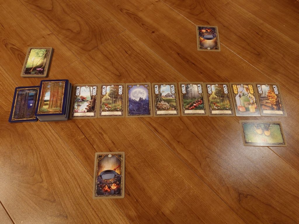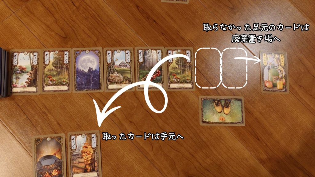 足元にあるカードはすぐ腐ってしまいますので、今回取らなかったカードをすぐ廃棄置き場に移動します。その後全てのカードを右にスライドし、新たに2枚のカードを場に並べます。