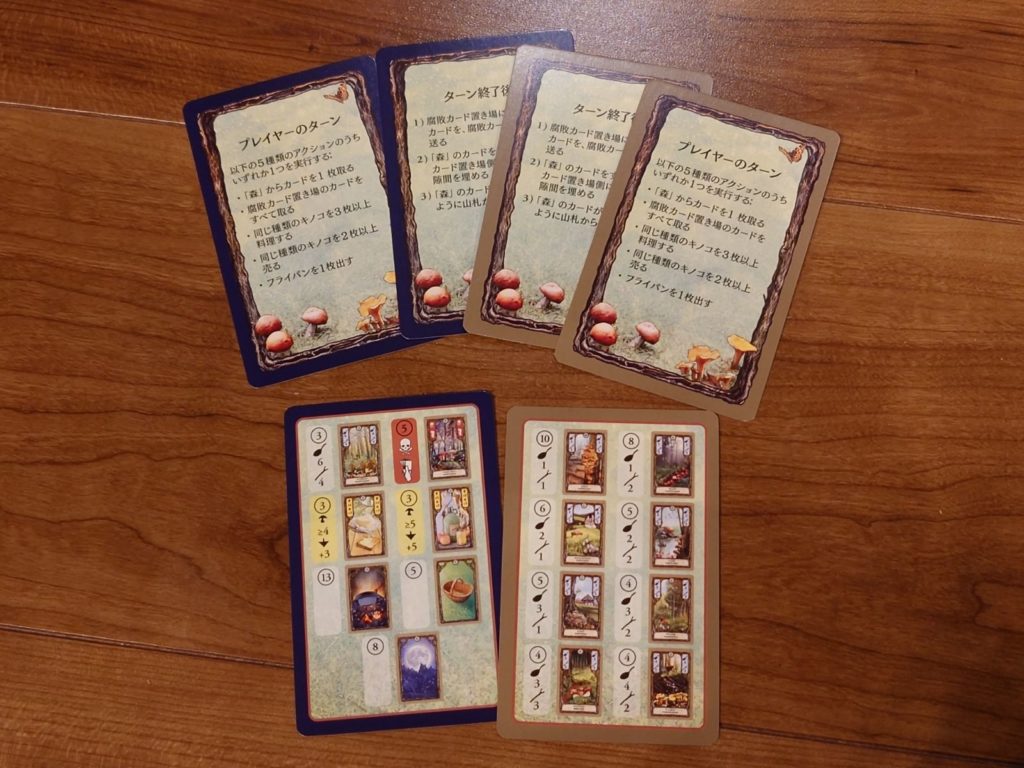 場に並んだカードからきのこを集め、料理して得点を競う2人用カードゲームです。