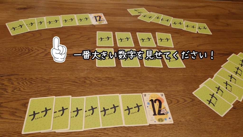 全員一斉にカードを出し、『出したカードより小さく、最も近い数字の最後尾』となるように並べていきます。
